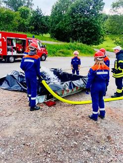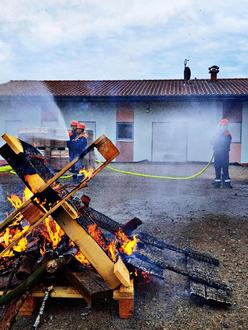 Im Anschluss wurde der Ernstfall geprobt: Ein angenommener Brand einer Gartenhütte stellte die Gruppe vor eine echte Herausforderung, die sie jedoch mit Bravour und einem strukturierten Löschangriff meisterte.