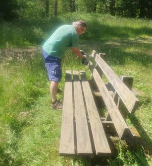 Der Lebensgefährte von Ingrid Spain, Steffen Fietz, hat die drei Bänke am Finkenbrunnen abgeschliffen, zusammen mit Ingrid Spain. Die beiden werden die drei Bänke nun auch noch gemeinsam streichen. Eine hervorragende freiwillige, beispielhafte Aktion von zwei Ortsbürgen.