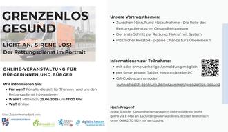 Zu den Vorträgen: Den Anfang macht Josias Heinz, Wissenschaftlicher Mitarbeiter im Fachbereich Gesundheit an der Technischen Hochschule Mittelhessen (THM), mit dem Thema „Zwischen Notruf und Notaufnahme – Die Rolle des Rettungsdienstes im Gesundheitswesen“, danach folgt „Der erste Schritt zur Rettung: Notruf mit System“ von Oliver Schütz, Sachgebietsleiter Rettungsdienst Rheingau-Taunus-Kreis. Als Dritter wird Jörg Oberkinkhaus, Fachbereichsleiter Rettungsdienst Kreis Bergstraße, zum Thema „Plötzlicher Herztod - (k)eine Chance fürs Überleben?!“ referieren. Im Anschluss wird es wieder ausreichend Raum für Fragen und Diskussion geben.