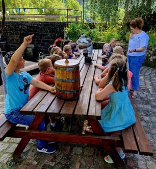 Um selbst auszuprobieren, wie die Herstellung von Butter funktioniert, erhielt jeder von uns einen kleinen verschließbaren Becher, befüllt mit etwas Schlagsahne. Dann mussten wir schütteln - ohne dabei die Sahne allzu sehr mit unseren Händen zu erwärmen. Nach wenigen Minuten spürten wir, dass sich die Konsistenz der flüssigen Sahne veränderte. Beim Öffnen unseres Bechers stellten wir alle begeistert fest: aus der Sahne war nun ein cremiger Butterkleks geworden.