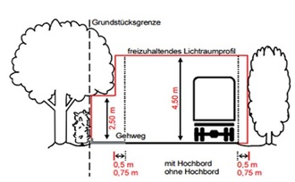Sollte Ihr Grundstück an öffentliche Verkehrsflächen angrenzen, sollte dringlichst das Lichtraumprofil beachtet werden. Die Pflanzen sollten optimalerweise bis zu einer Höhe von 4,50 Meter über Straßen und von 2,50 Metern nicht über Geh- und Radwege ragen.