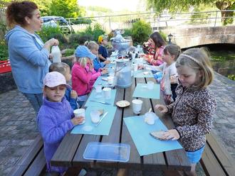 Die Kinder wurden in zwei Gruppen eingeteilt. Eine Gruppe durfte zuerst Butter machen und die andere Gruppe so lange spielen gehen.