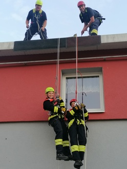 Zwei Kameradinnen bei der Eigenrettung vom Feuerwehrhausdach