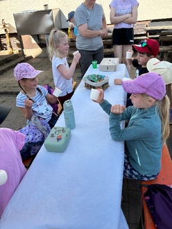 Und dann stand auch schon eine Stärkung an: Gemeinsam durften die nun bereits Experten und Expertinnen der 1b, erneut ihre eigene Butter schütteln, um im Anschluss ein Butterbrot zu genießen. Auch die frische Milch und selbstgebackene Kuhfleckenmuffins der Familie Koch wurden gerne verköstigt.