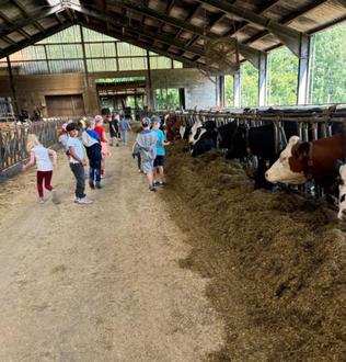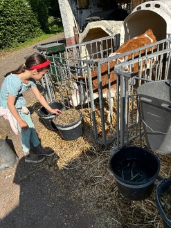 Gut gestärkt, konnte nun der Kuhstall besichtigt werden und die Kinder zögerten nicht lange, tatkräftig beim Füttern zu helfen. Später sahen sie dabei zu, wie die Futtermischmaschine weiteres Futter in großen Mengen an die Kühe verteilte, so dass diese auch gut gesättigt werden konnten.