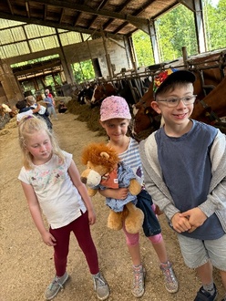 Um das in der Theorie erworbene Wissen nun auch in der Praxis zum Teil selbst erproben zu dürfen, startete die Löwen-Klasse gemeinsam mit Frau Nersatt und Frau Haas früh morgens mit dem Bus ihre kurze Reise nach Güttersbach. Dort wurden sie bereits von der Tochter von Frau Koch herzlich an der Hofeinfahrt in Empfang genommen und zu den Kühen geführt. Neben den Kühen begrüßten natürlich auch direkt die Katzen und die Hunde die Klasse 1b herzlich und wurden zur Belohnung bestaunt.