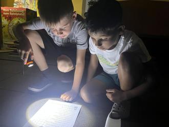 Mit Taschenlampen auf Entdeckungstour im Schulhaus.