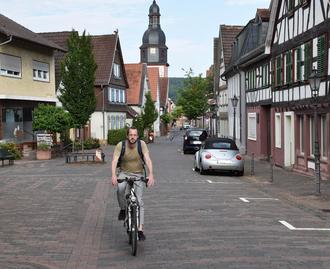 Innerorts auf Tour: Ein Radfahrer fährt durch den Ortskern von Breuberg-Neustadt. Breuberg steht im ADFC-Test, bezogen auf den Odenwaldkreis, ganz vorn.