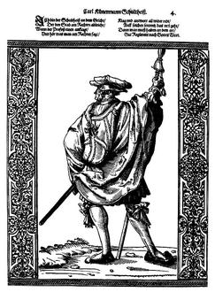 Auf diesem Holzschnitt zeigt sich ein selbstbewusster Schultheiß mit dem Rücken zum Betrachter gewandt. Die stilisierte Darstellung stammt aus dem 16. Jahrhundert. Im oberen Spruchtext heißt es u.a.: „Dann man muß halten an dem ort / Gut Regiment nach Gottes Wort.“