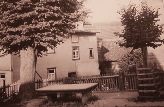 Lindenplatz in Güttersbach. Im Schatten der Lindenbäume steht der angebliche Gerichtstisch. Nach Hans Gelbhaar (1980) wurde im Zuge einer Kirchenrenovierung (1728 oder 1740) die alte Altarplatte mit den Maßen 2,50 m x 1,25 m aus der Kirche auf den Lindenplatz verbracht. Anschließend bildete sich im Lauf der Zeit die Legende vom Gerichtstisch unter den Linden. Dennoch ist für Güttersbach eine sog. Malstätte (Versammlungsort eines Gerichts) eindeutig nachweisbar. Unter den „Gerichtslinden“ am Dorfplatz, in unmittelbarer Nähe zur Kirche, tagte alljährlich ein Haingericht. Auf dem Bild ist im Hintergrund das Gasthaus „Zum Goldenen Löwen“ (links), die ehemalige Schulscheuer (mittig im Hintergrund) und das Schulhaus (rechts, verdeckt) zu sehen (Aufnahme um 1935).