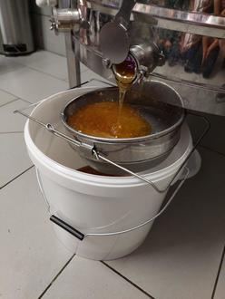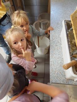 Auch wir durften Honig ernten. Uns wurde gezeigt, wie der Wachsdeckel abgenommen wird und wie die Waben geschleudert werden. Der fertige Honig kam unten aus der Schleuder und wir durften zwei Gläser Honig mit in die Kita nehmen.