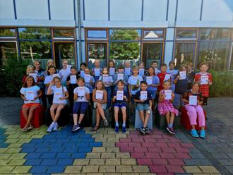 Sportabzeichen: Die Kinder, die ein Sportabzeichen ablegen konnten, halten stolz ihre Urkunden und Anstecker in die Kamera.