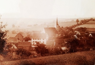 Blick vom „Helmsberg“ aus auf die Güttersbacher Dorfmitte (Aufnahme um 1910). Zentral gelegen, die Kirche und das Pfarrhaus sowie der sog. Lindenplatz. Dorthin strömten die Ortsbewohner, wenn der Schultheiß zu einer Versammlung oder zum Gericht gerufen hatte. Für jene Bildquelle sei Herrn Stephan Gelbhaar vielmals gedankt.