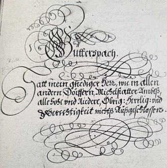 „Gütterspach. Hatt mein gnediger Herr, wie in allen andern Dörffern, Michelstatter Ambtß, alle hohe und niedere, Obrig: Herrlig: und Gerechtigkeit nichtß Ausgeschlossen.“ Titelseite für das Dorf Güttersbach im Gültbuch Michelstadts. Die im Gültbuch niedergeschriebene Jahreszahl 1554 kann für Güttersbach und Hüttenthal nicht stimmen, da alle aufgelisteten Personen in der Zeit um 1618 im Güttersbacher Kirchenbuch auftauchen.