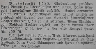 In den Erbacher Amtsprotokollen findet sich eine Eheberedung aus dem Jahr 1588. Der gleichnamige Sohn des Schultheißen Hans Brand (des Alten), Hans Brand (der Junge), ehelichte die verwitwete Anna Kempel aus Ober-Mossau und erwarb ein Anwesen für 250 fl. (Gulden).