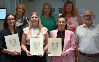 Drei lehrreiche Jahre liegen hinter Denise Abbé, Lara Kritzinger und Lea-Sophie Knust. Sie haben die Ausbildung zur Verwaltungsfachangestellten beendet, heute (16.7.) hat Landrat Frank Matiaske ihnen die Zeugnisse überreicht: „Ich danke Ihnen für Ihr Engagement in dem beruflichen Abschnitt, der nun hinter Ihnen liegt, und wünsche Ihnen für Ihren weiteren Weg viel Erfolg.“