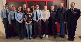 Das Bild zeigt den neuen Vorstand (v.l.n.r.) Lucas Katzenmeyer (Stv. Jugendfeuerwehrwart), Ingo Katzenmeyer (Wehrführer), Kira Spitzberg-Kusch (Schriftführerin), Matthias Kusch (2. Vorsitzender), Neele Möser (Kassenwartin), Robin Holschuh (Beisitzer), Marco Schott (1. Vorsitzender), Leon Helm (Jugendfeuerwehrwart), Michael Karb (Stv. Wehrführer). Zu den ersten Gratulanten gehörten Harald Eisenhauer (1. Beigeordneter) und Timo Münch (Gemeindebrandinspektor).