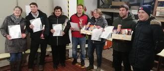 Das Bild zeigt die Sieger (v.l.n.r.) Tanja Lenz (3. Platz Frauen), Robin Holschuh (3. Platz Männer), Heike Holschuh (2. Platz Frauen), Ingo Katzenmeyer (2. Platz Männer), Doris Kessler (1. Platz Frauen), Felix Holschuh (1. Platz Männer). Die Präsente wurden überreicht von Leon Helm (Jugendfeuerwehrwart).