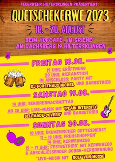 Wir möchten an dieser Stelle auf die anstehende Quetschekerwe in Hiltersklingen aufmerksam machen. Vom 18. bis 20. August findet die Quetschekerwe in diesem Jahr beim Hofcafé „Im Griene“ statt. An drei Tagen gibt es wieder ein abwechslungsreiches Programm mit leckerem Essen und kühlen Getränken. Wir laden hiermit alle Mitbürgerinnen und Mitbürger recht herzlich ein, an diesem Wochenende zusammen mit uns zu feiern. Wir würden uns besonders über ein paar helfende Hände oder eine Kuchenspende freuen, damit dieses Fest zu einem richtigen Erfolg wird. Entsprechende Listen wurden in Hiltersklingen verteilt, weitere Ausdrucke liegen beim Hofcafé und bei der Tankstelle zum Abholen bereit. Weiterhin sind wir noch auf der Suche nach interessierten Teilnehmern für unseren Kerweumzug am Sonntag, auch hierfür gerne im Hofcafé melden. Wir freuen uns bereits jetzt, euch auf der Quetschekerwe begrüßen zu dürfen und hoffen auf zahlreiches Erscheinen.