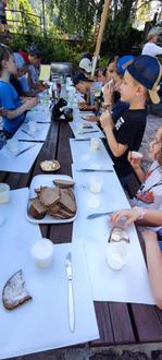 Einer der Höhepunkte war natürlich die eigene Produktion von Butter. Dazu erhielt jeder von uns einen kleinen verschließbaren Becher, der anschließend mit nach Hause genommen werden konnte, um auch zu Hause Butter herzustellen. Dieser wurde mit etwas Sahne befüllt und dann wurde geschüttelt. Nach einigen Minuten spürte man, dass sich die Konsistenz der Sahne veränderte. Es hatten sich ein Butterklecks und Buttermilch gebildet. Beides durfte verköstigt werden.