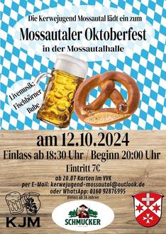 In diesem Jahr feiert die Kerwejugend in Kooperation mit dem Ortsbeirat Unter-Mossau das erste Mossautaler Oktoberfest. Wir freuen uns auf einen unvergesslichen Abend mit Livemusik von den „Fischbörner Buben“ in bayerischer Festzeltatmosphäre. Auch für das leibliche Wohl wird bestens gesorgt sein. Für alle Gäste in Tracht gibt es außerdem einen Begrüßungsschnaps.