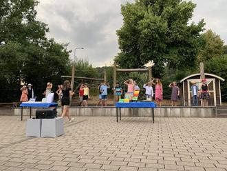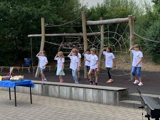 Im Anschluss an die Zeugnisausgabe sowie dem musikalischen Beitrag der Jagdhornbläser kam dann auch die langersehnte Tanzüberraschung, für die die Viertklässler*innen über Wochen hinweg mit Frau Hörr in Sport geübt hatten. Als eine Art Flashmob begannen vereinzelte Schüler*innen zum Lied „Fantasy Girl“ zu tanzen, dessen Schritte aufgrund seiner Popularität mittlerweile Groß und Klein kennen. Nach und nach kamen immer mehr Schüler*innen hinzu, sodass auch irgendwann die Eltern und Geschwister dazu aufgefordert waren, mitzutanzen. Mit strahlenden Gesichtern ging es wieder zurück an die Plätze.