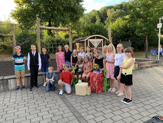 Anschließend an das Lied „Ab in den Süden“, das von der Klasse 4 in bunten Kostümen vorgetragen wurde, ging es dann auch schon zur Zeugnisübergabe über. Zusammen mit ihrem Zeugnis und Urkunden für erbrachte Leistungen auf Online-Plattformen, bekamen die Kinder ein Erinnerungsheft überreicht, in dem sich Bilder aus den letzten vier Jahren befanden. Zusätzlich gab es auch noch ein kleines buntes Köfferchen aus Papier, das all die Wünsche aus der Ansprache enthält und symbolisch für die Weiterreise der Viertklässler*innen stehen sollte. Die zwei Klassenbesten, Hanna und Aaron, bekamen für ihre besonderen Leistungen außerdem ein Buch geschenkt.