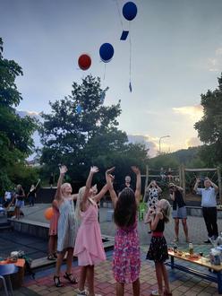 Die Bühne gehörte weiterhin der Klasse 4. Mit dem Abschlusslied „Was für eine geile Zeit“ von Ben Zucker blickten die Schüler*innen gesanglich auf 4 Jahre Grundschule zurück. Symbolisch verließen sie gemeinsam mit Frau Manlik und Frau Hartngael das Schulgelände und läuteten damit das Ende der Grundschulzeit ein. Mit tosendem Applaus kamen sie wieder zurück und konnten endlich ihre Heliumballons mit ihren Wünschen steigen lassen, was einen schönen und runden Abschluss darstellte.