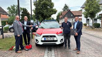 Über ein hochwertiges LED-Beleuchtungssystem von der SparkassenVersicherung, überreicht von den Herren Martin Eifert und Matthias Köhn, freuen sich Bürgermeister Dietmar Bareis sowie Gemeindebrandinspektor Timo Münch.