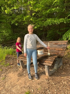 Nele und Lina Heckmann streichen die Bank, für die ihre Familie die Patenschaft übernommen hat.