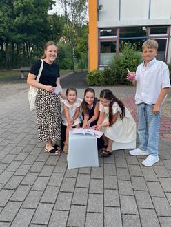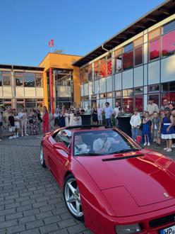 Besonders begeistert waren die Kinder von einer Überraschung, die sie mit Frau Baumann geplant hatten: Frau Appel drehte eine Ehrenrunde in einem Ferrari, den ein Bekannter zur Feier des Tages mitgebracht hatte. Ein echtes Highlight für die ganze Klasse!