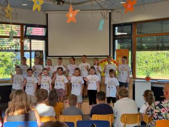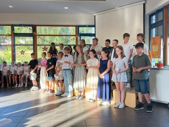 Auch die zweite Klasse brachte sich gekonnt mit herzigen Liedern und kurzen Texten ein und verabschiedete die Großen auf liebevolle Weise.