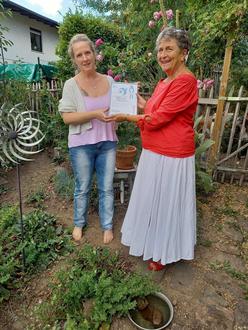 links Frau Pfundt mit Sigrid Hilbert, die die Auszeichnung im Namen des NABU Kreisverbandes, im naturfreundlichen Garten der Familie Pfundt, überreichte.