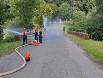 Am Freitag, dem 25.08.2023 stand wieder eine Übung der Jugendfeuerwehr Hiltersklingen an, gemäß Dienstplan ging es um Gefahren an der Einsatzstelle. Angenommen war der Sturz eines Radfahrers an der Bundestraße, bei dem der Radfahrer eine steile Böschung hinabgestürzt war. Da der Übungsinhalt sich um Gefahren der Einsatzstelle handelte, wurde zunächst die korrekte Vorgehensweise beim Absperren der Einsatzstelle erläutert und entsprechend umgesetzt. Anschließend musste die Bergung des verletzten Radfahrers durchgeführt werden, hierzu wurden die Schleifkorbtrage und die Steckleiter zum Einsatz gebracht. Nachdem der Radfahrer in die Schleifkorbtrage gelegt werden konnte, war es möglich diese über die Steckleiterteile nach oben auf die Fahrbahn zu ziehen, wo die verletzte Person an den Rettungsdienst übergeben werden konnte. Da die insgesamt acht Jugendlichen diese Aufgabe sehr professionell und schnell gemeistert haben, konnte der Einsatzauftrag nochmals erweitert werden. Weiterhin angenommen wurde anschließend ein Flächenbrand in der Nähe der Unfallstelle. Mit Hilfe des Waldbrandsets wurde ein Aufbau gemäß Feuerwehrdienstvorschrift 3 erledigt und die Bekämpfung des Flächenbrandes eingeleitet. Da auch hier die Jugendlichen eine schnelle Umsetzung gezeigt haben, kam auch der Spaß nicht zu kurz und die Jugendlichen verschafften sich eine Abkühlung mit dem Löschwasser. Die Jugendfeuerwehr steht eben für Engagement, Kameradschaft, aber auch viel Spaß.
