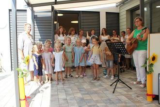 Die Kinder bei ihrem Vortrag des Liedes "Besucht uns mal im Kindergarten“ bei der offiziellen Einweihung der neuen Kindertagesstätte.