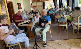 Die Hausmusikgruppe Annerose und Gerd Beisel aus Falken-Gesäß und Architekt Günther Holschuh aus Beerfelden mit ihrer diatonischen und einer steirischen Harmonika und einem Klangbrett entfalteten ihre Begeisterung am klangvollen Spiel und luden Gäste im voll besetzten Gastraum zum herzhaften Gesang aus voller Kehle ein, die altbekannten Volkslieder mitzusingen. Zu aller Textsicherheit der schon lange nicht mehr gesungenen alten Melodien waren Liedblätterausgelegt.