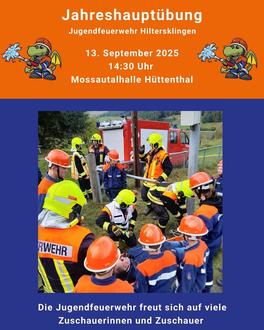 hiermit lade ich Sie zur diesjährigen Jahreshauptübung der Jugendfeuerwehr Hiltersklingen am Samstag, den 13. September 2025 um 14:30 Uhr an der Mossautalhalle in Hüttenthal recht herzlich ein.