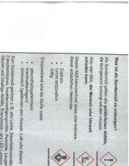 Es wird darum gebeten, Sonderabfälle beim Sammelpersonal abzugeben und nicht einfach an der Sammelstelle abzustellen. Sie gefährden sonst insbesondere Kinder und unsere Umwelt.