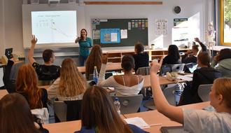 Ein Beispiel für die Umsetzung des Digitalpakts im Odenwaldkreis ist die Theodor-Litt-Schule in Michelstadt. „Bei uns ist inzwischen jeder Klassenraum technisch entsprechend ausgestattet“, schildern Schulleiterin Tamara Prostmeyer und die Digitalisierungs-Beauftragte der Schule, Elisa Kaiser. „Außerdem haben alle Lehrerinnen und Lehrer iPads, so dass sie ihren Unterricht dort, wo es pädagogisch geboten ist, digital gestalten können.“ Kaiser selbst unterrichtet unter anderem Mathematik. Eine ihrer Klassen ist die 10MA, in der sie ihr Lehrer-iPad und ein Whiteboard einsetzt, um Formeln und Graphen zu erläutern.