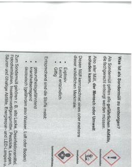 Es wird darum gebeten, Sonderabfälle beim Sammelpersonal abzugeben und nicht einfach an der Sammelstelle abzustellen. Sie gefährden sonst insbesondere Kinder und unsere Umwelt.