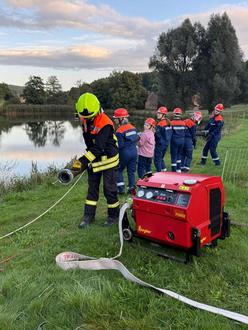 Die Jugendfeuerwehrmitglieder bauen zusammen die Saugleitung aus offenem Gewässer auf