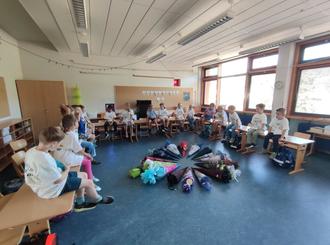 Dem Programm folgten Kinder und Erwachsene mit großer Aufmerksamkeit und belohnten jede Darbietung mit lautem Beifall. Nach dem ersten offiziellen Schulfoto gemeinsam mit Frau Lenz, Frau Hartnagel und Herrn Bareis folgten die Erstklässler*innen ihrer Klassenlehrerin in ihren Klassensaal, wo bereits die kunterbunten Schultüten und das Klassentier Gustav auf sie warteten. Wir freuen uns auf die gemeinsame Zeit mit unseren neuen Grundschüler*innen und wünschen ihnen einen erfolgreichen Start ins erste Schuljahr! Ein besonderer Dank gilt den Eltern der Klasse 4a, die den Schulhof schön festlich geschmückt hatten und während der Einschulungsfeier für das leibliche Wohl gesorgt haben.