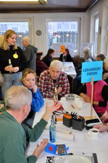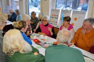 Vorbereitet waren drei Tischgruppen. Eine Tischgruppe befasste sich mit Ideen für Angebote. Es lagen alle bereits schon eingebrachten Ideen auf Pappkreisen aus, leere Pappkreis konnten mit neuen Ideen beschrieben werden. Mit Herzstickern konnten Ideen als besonders schön unterstützt werden. Auch wurde besprochen für welche Generationen die Ideen geeignet sind. Begleitet wurde die Ideengruppe von Sina Bledau von Kokonsult.