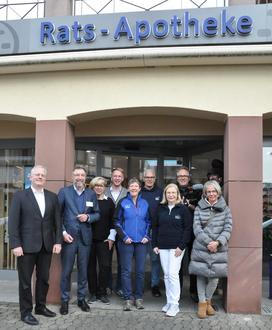 Über einen erfolgreichen Drehtag freuten sich (v. l. n. r.): Marius Schwabe (Geschäftsführer / OREG), Udo Steinmeier (Projektmitglied / Trapeze Group Deutschland), Anja Sylvester (Projektkonsortialführung / LaLoG LandLogistik), René Karg (Projektleiter / OREG), Christine Walther, Ralf und Jutta Sommer (alle Rats-Apotheke) sowie das Dreh-Team des HR um Petra Boberg. Nicht auf dem Bild: Rainer Heist (Odenwälder Landgenuss) und Jan-Luca Merkel (Erbacher Markthalle / Odenwaldbox)