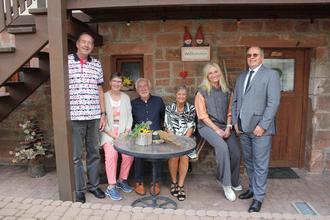 Foto 03: Zum 60. Mal machen Arie und Annie Palsrok (dritter und vierte von links) bereits Urlaub in Mossautal. Darüber freuen sich neben ihren langjährigen Vermietern Wilfried und Doris Weitzel (von links) auch die zweite Vorsitzende der Mossautal-Touristik Silke Christmann und Mossautals Bürgermeister Dietmar Bareis.