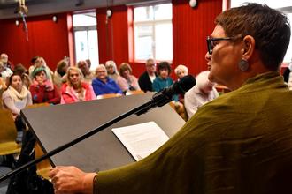 Pfarrerin Sabine Färber-Awischus während ihres Fachvortrages in der alten Turnhalle.