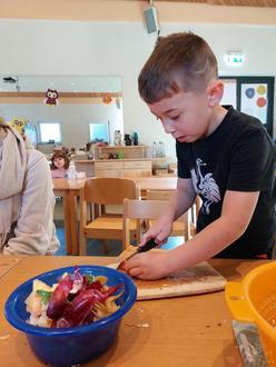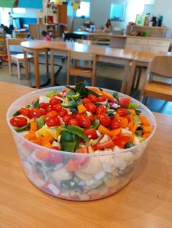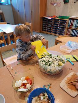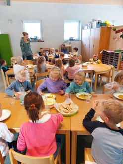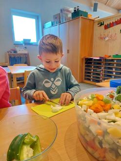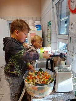Zur Vorbereitung brachten die Kinder von Zuhause viel Gemüse wie Kartoffeln, Karotten, Zucchini, Kürbisse, Paprika und Kräuter in den Kindergarten mit. Vieles davon hatten die Kinder mit den Eltern und Großeltern im eigenen Garten geerntet. Am Vormittag schälten sie das mitgebrachte Gemüse und schnippelten es fein auf dem Schneidebrett. Jeder durfte mithelfen. Anschließend wurden die Schnellkochtöpfe aufgefüllt. Schon bald konnte man den würzigen Duft einer frisch gekochten Gemüsesuppe wahrnehmen. Mit Brot und Brezeln schmeckte sie hervorragend. An der festlichen Mahlzeit nahmen alle Kindergarten- und Krippenkinder sowie manche Eltern und Großeltern teil. Die Kindertagesstätte kann auf seine jungen Köche stolz sein.