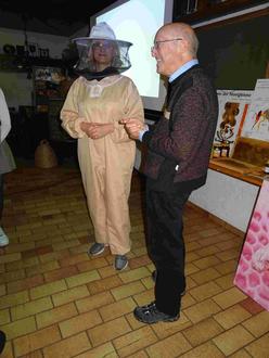 Während des Vortrags ihres Vaters Dieter Schmidt demonstriert dessen Tochter Sandra den Imker-Schutzanzug.