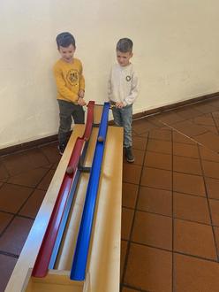 Dabei gab es spannende Erlebnisse zu erforschen, wie z. B. einen Würfel aus Einzelteilen zusammenzubauen, Gegenstände zu ertasten oder bei einer zweigleisigen Kugelbahn festzustellen, dass der gerade Weg nicht zwangsläufig der schnellste ist. Höhepunkt war für die Kinder eine Riesenseifenblase, in die man sich hineinstellen konnte.