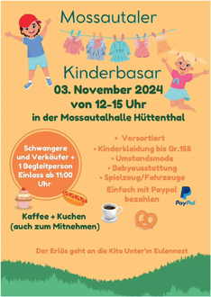 Bereits zum vierten Mal in Folge organisiert der Elternbeirat der Kita Unterm Eulennest den Basar und bietet vorsortiert eine große Auswahl an gut erhaltener Baby- und Kinderkleidung, an Büchern und Spielzeug sowie Babyausstattungen. Auch für das leibliche Wohl wird wieder bestens gesorgt. Eine große Kuchen- und Tortenvielfalt sowie Herzhaftes wird - gern auch zum Mitnehmen - im Basar-Café angeboten.